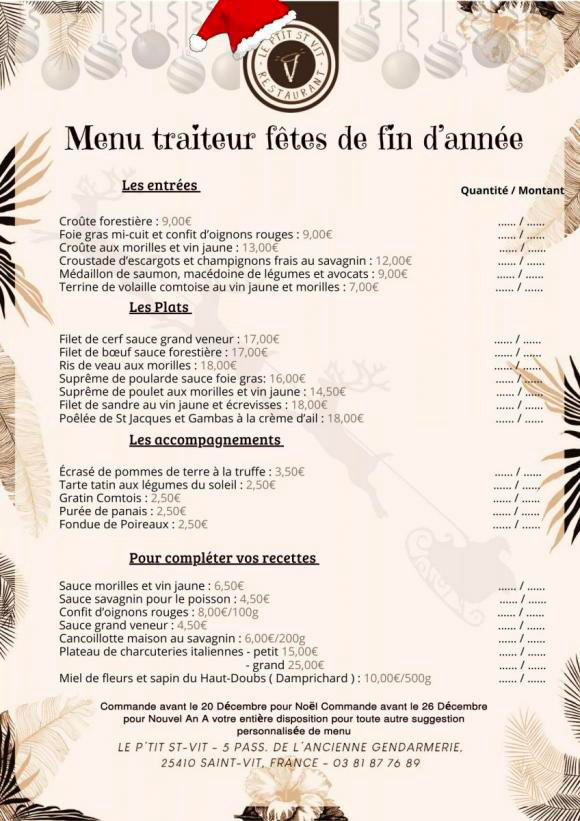 Le Ptit St Vit travaille des produits frais et de saison pour vous proposer des plats gustatifs et de qualité. Nos produits italiens sont directement importés d'Italie et nous élaborons des plats en fonction de nos fournisseurs locaux. Les menus à l'ardoise du jour présentent plusieurs plats comme du risotto aux coquilles Saint-Jacques , du filet de bœuf, de la croûte aux morilles.